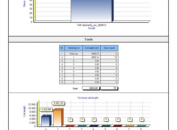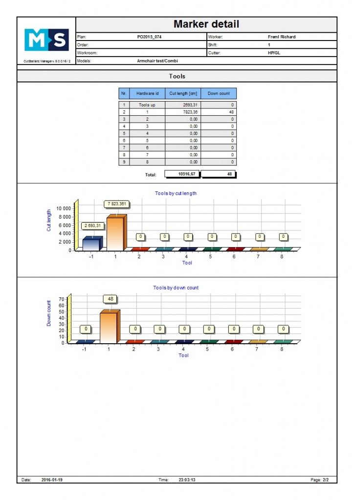 CutStatistic system records the statistic data into database. The source of data is CutNest system, which gathers following information: names of cut plans and models, list and quantity of pieces, time of cutting, material area, waste, efficiency, picture of marker, etc. The CutStatistic application enables to work with database and create reports for selected time interval, shift, worker, materials, models, etc. Following reports are available: History of production, Marker (plan) details, Models/pieces, Worksheet, Workers productivity. All reports can be customized and additional reports can be prepared.